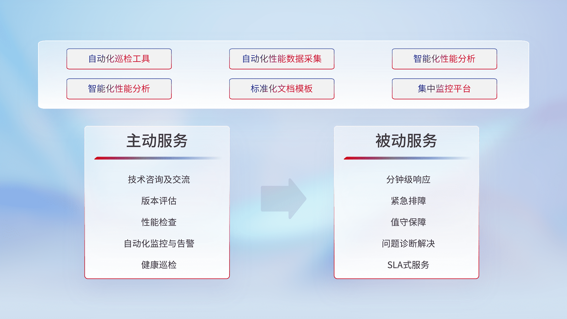 智能化工具和标准化文档,,,保障服务质量,,,,提供主动服务(包含技术咨询、、版本评估、、、、性能检查、、、、自动化监控与告警、、、、健康巡检)和被动服务包含(分钟级响应、、、、紧急排障、、、、值守保障、、、、问题诊断解决、、、、SLA服务)。。。。