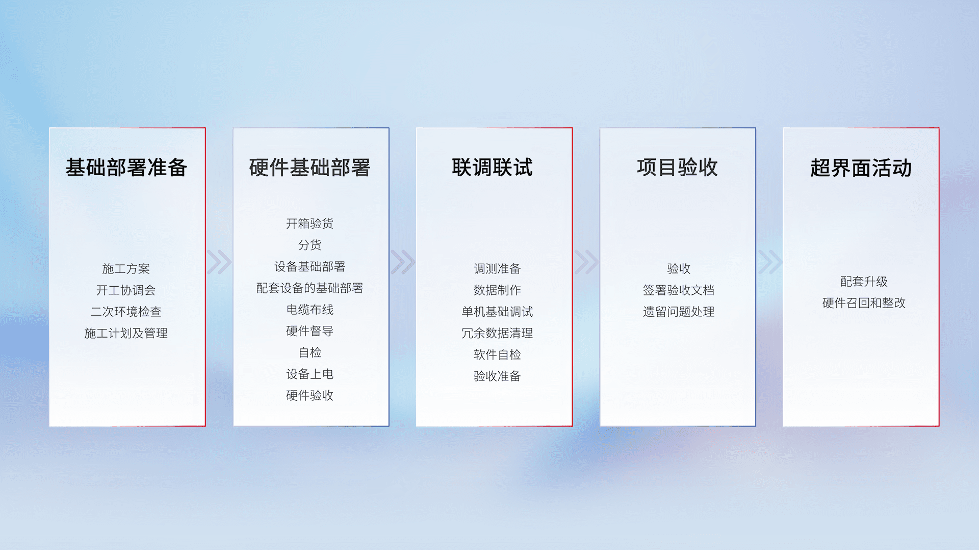 从基础部署准备、、、、硬件基础部署、、、、联调联试、、项目验收、、、、越界面活动的全过程可追溯,,保证施工质量和进度。。